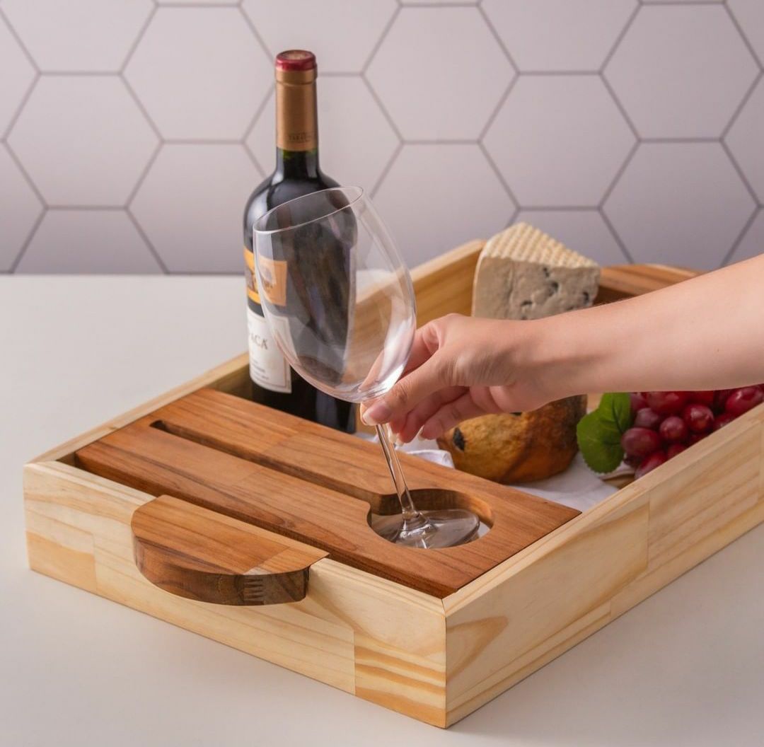 Bandeja P/ Vinho e Taças em Teca e Pinus 60x35x8cm