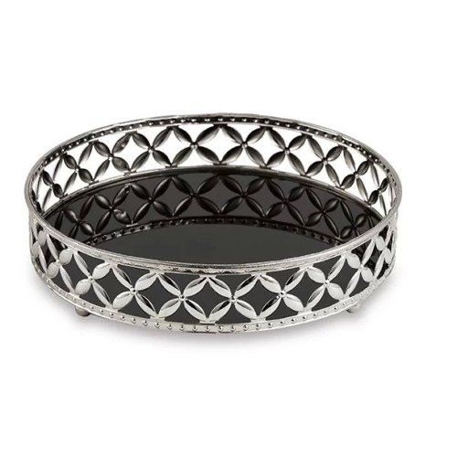 Bandeja redonda em metal com espelho preto , ela tem 20cm de diâmetro e 05 cm de altura.