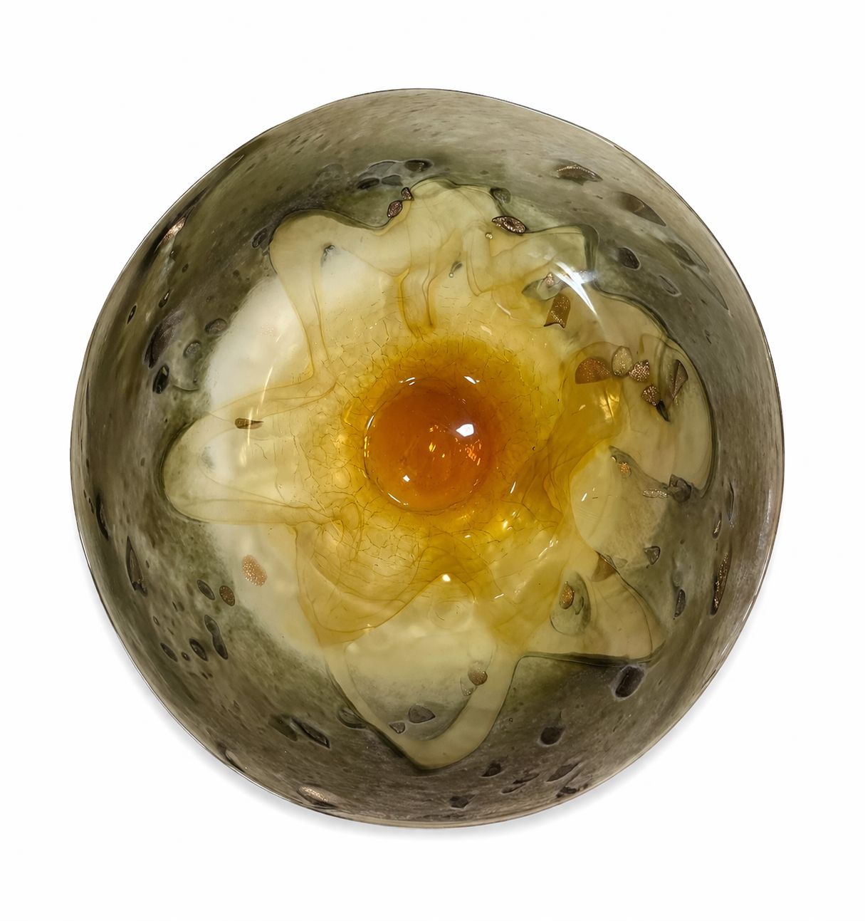 O centro de mesa possui formato arredondado com tons amarelados e verdes que reproduzem um efeito visual único, com detalhe central vibrante que destaca a peça no ambiente. É leve e fácil de posicionar.