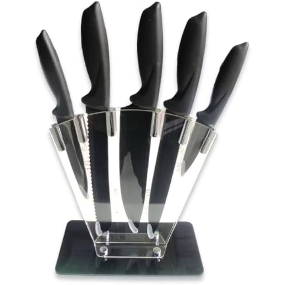 As facas são produzidas em aço inox, garantindo afiação e resistência contra corrosão. O conjunto acompanha um suporte em acrílico transparente que organiza as peças com segurança e estilo. Os cabos pretos são anatômicos, o que facilita o manuseio durante o uso. O conjunto atende às necessidades básicas para cortar, fatiar e picar alimentos variados.