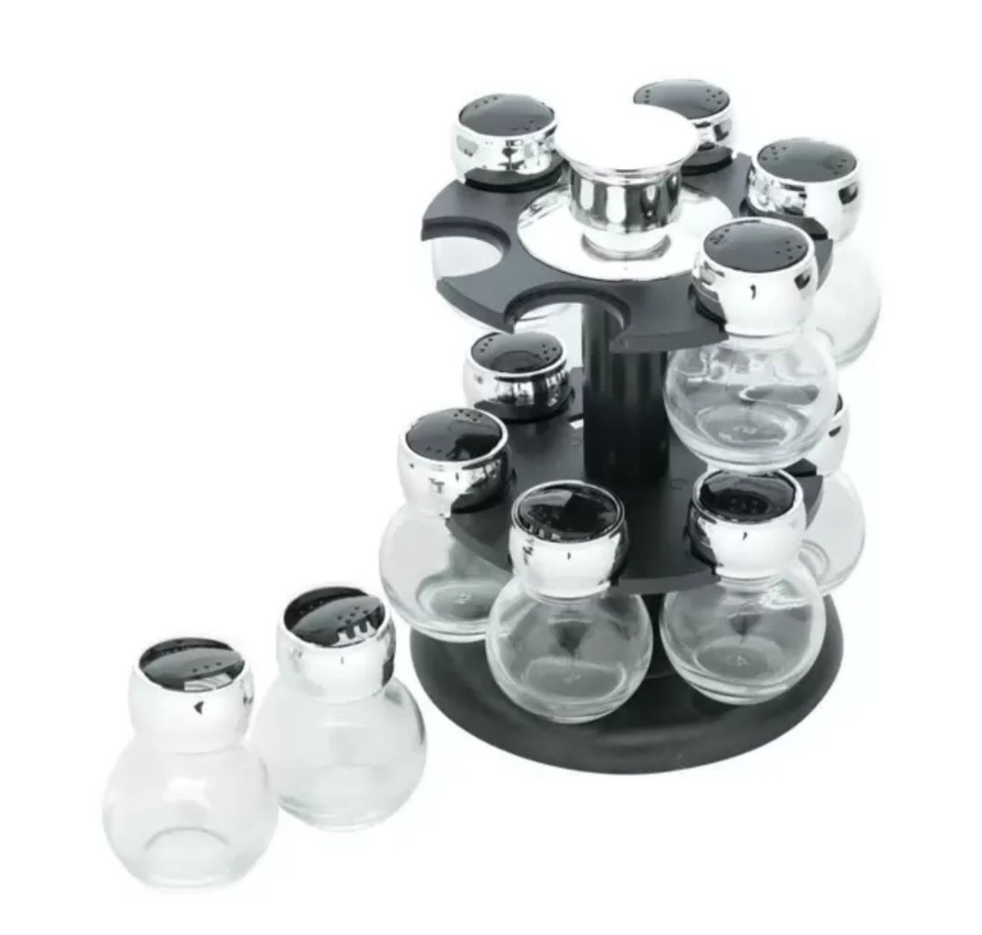 Cj 12 Porta Temperos Vidro c/ Tampa Plástico e Base Giratória Poli Preta - Bon Gourmet
