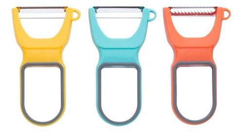 Este conjunto é composto de 3 unidades, cada qual permite descascar legumes ou frutas em espessuras apropriadas para cada caso.