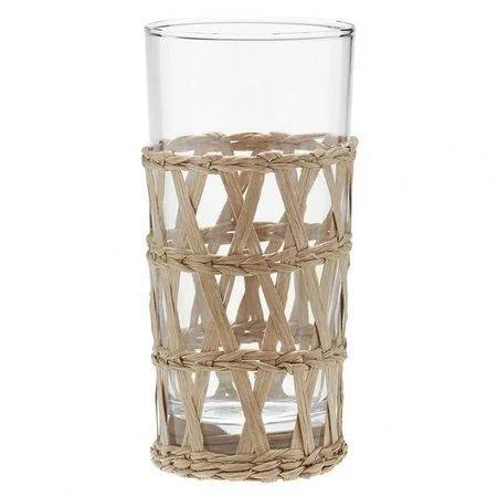Copo de vidro revestido com um trançado de palha na cor natural.