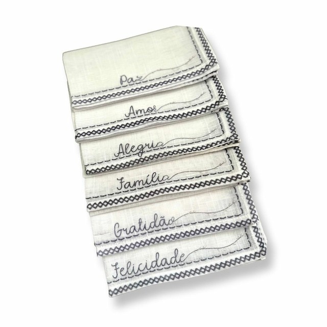 Guardanapo em tecido tipo linho misto estampado com as opções de palavras: amor, paz, alegria, felicidade, familia e gratidão.