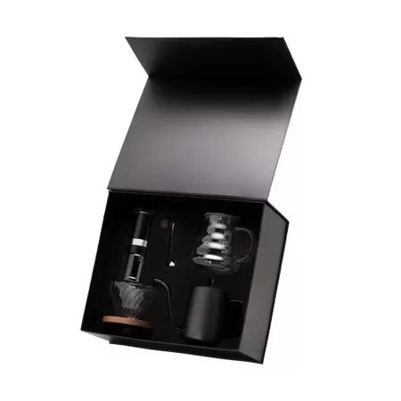 Para quem ama o ritual de preparar um café, apresentamos um conjunto Gourmet feito para te acompanhar em cada etapa do preparo dessa bebida tão especial. Desde o moer dos grãos de café até o servir em uma jarra em vidro borosilicato, extremamente resistente à altas temperaturas. Além desses dois itens, completam o conjunto suporte para filtro Hario em vidro e chaleira de aço inox com bico de ganso para adicionar a água ao filtro com precisão. O conjunto acompanha embalagem especial em box preto com apoio para cada peça. Perfeito para presentear os “Coffee Lovers”.