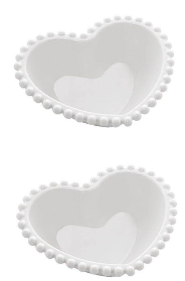 BOWLS DE CORAÇÃO 2 PEÇAS – BON GOURMET Uma mesa delicada: com estes bowls de coração você compõe um visual romântico, único e aconchegante! Perfeita para servir petiscos para uma noite de queijos & vinhos, ou frutas para acompanhar um delicioso fondue! Também ficam incríveis numa mesa de café da manhã, servindo iogurtes, frutas ou cereais! Você é quem manda! O que temos certeza é que você irá se encantar por este lindo conjunto com 2 bowls de coração em porcelana! Na cor branca, medem 15x13 cm com 5 cm de altura.