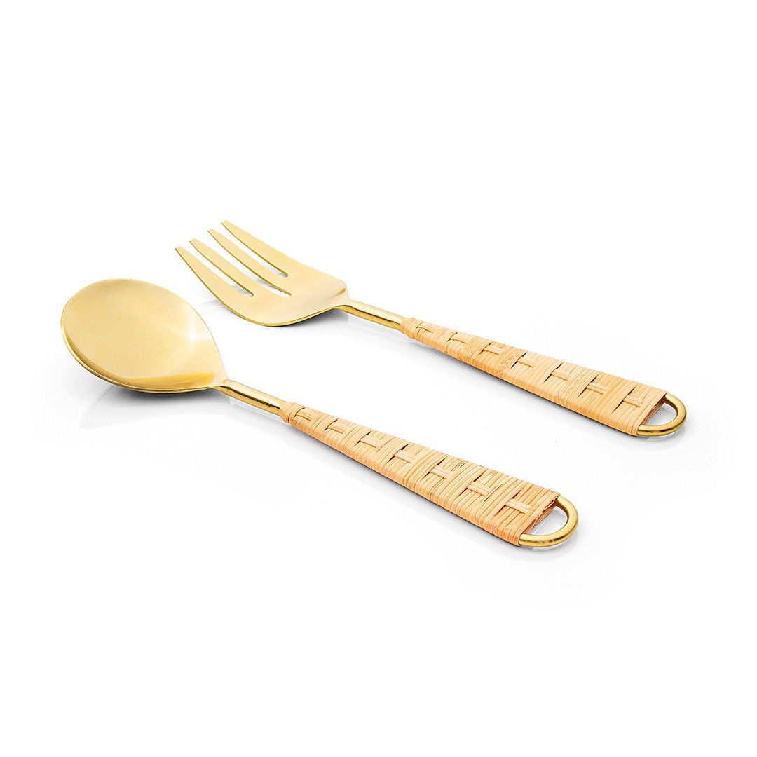 Os talheres apresentam alças revestidas em rattan, material que proporciona beleza e leveza ao conjunto. O acabamento metálico dourado é resistente e destaca o design moderno e rústico ao mesmo tempo. O conjunto tem duas peças: um garfo largo e uma colher, perfeitos para servir salada de forma prática.
