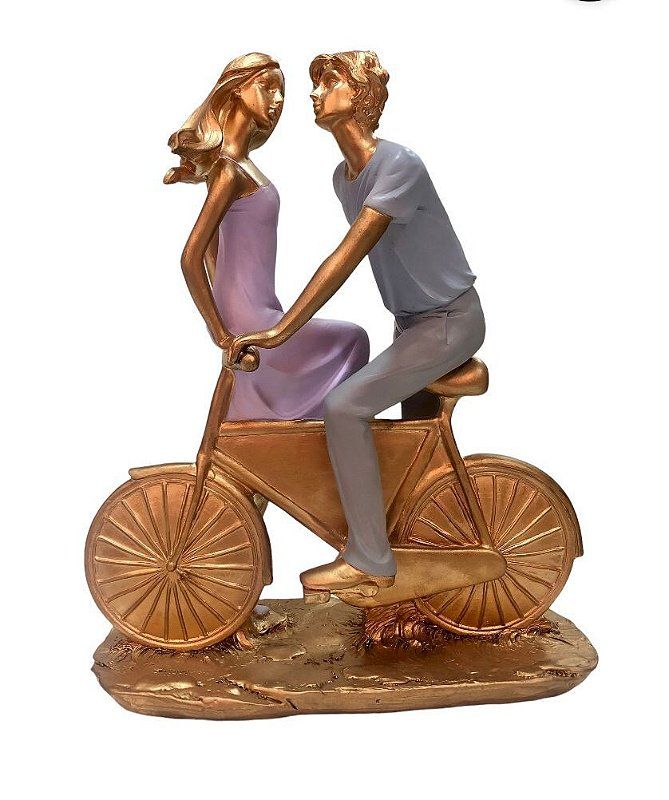 Os detalhes artísticos da escultura, desde as expressões do casal até os elementos da bicicleta, são cuidadosamente elaborados.