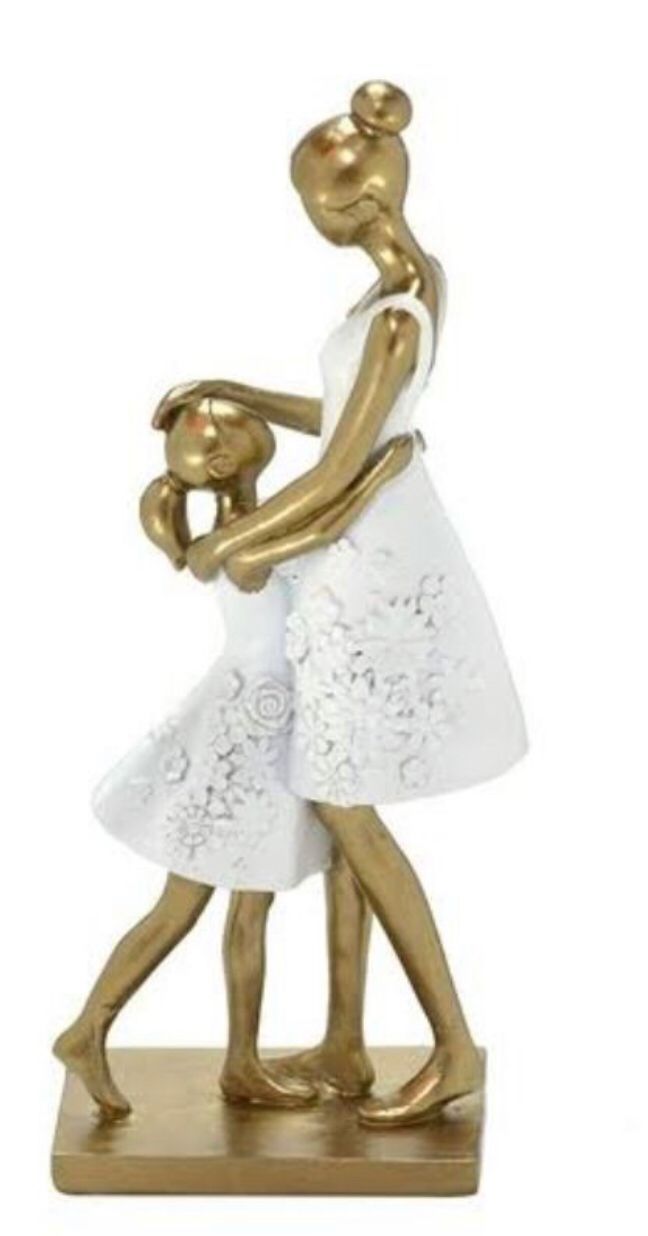Essa encantadora escultura em um momento entre uma mãe e sua filha é uma representação singela de momentos de carinho e conexão. Uma linda peça perfeita para completar aquela mesinha ou aparador da sua sala, escritório e vários outros ambientes. As roupas possuem um acabamento com flores que imita tecido, o que deixa a estatueta ainda mais interessante e rica em detalhes. Produzida em resina na cor dourada com branco esta peça demonstra uma cena do cotidiano que simboliza a simplicidade da vida em família.