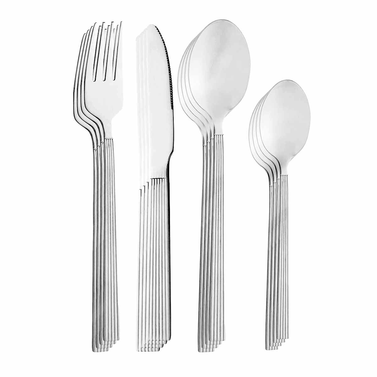 O faqueiro é feito de aço inox com design listrado no cabo, garantindo acabamento elegante e resistência ao uso contínuo. São 4 tipos de talheres essenciais no dia a dia: faca, garfo, colher de sopa e colher de chá, totalizando 16 peças que atendem até 4 pessoas. Produto ideal para organizar a mesa com estilo sem abrir mão da praticidade e durabilidade.