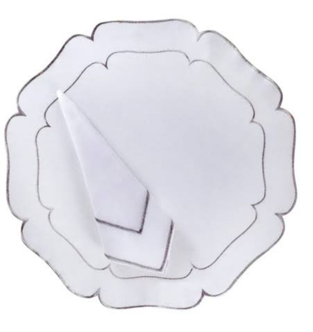 Lindo jogo americano redondo Branco com bordados na cor Cinza.