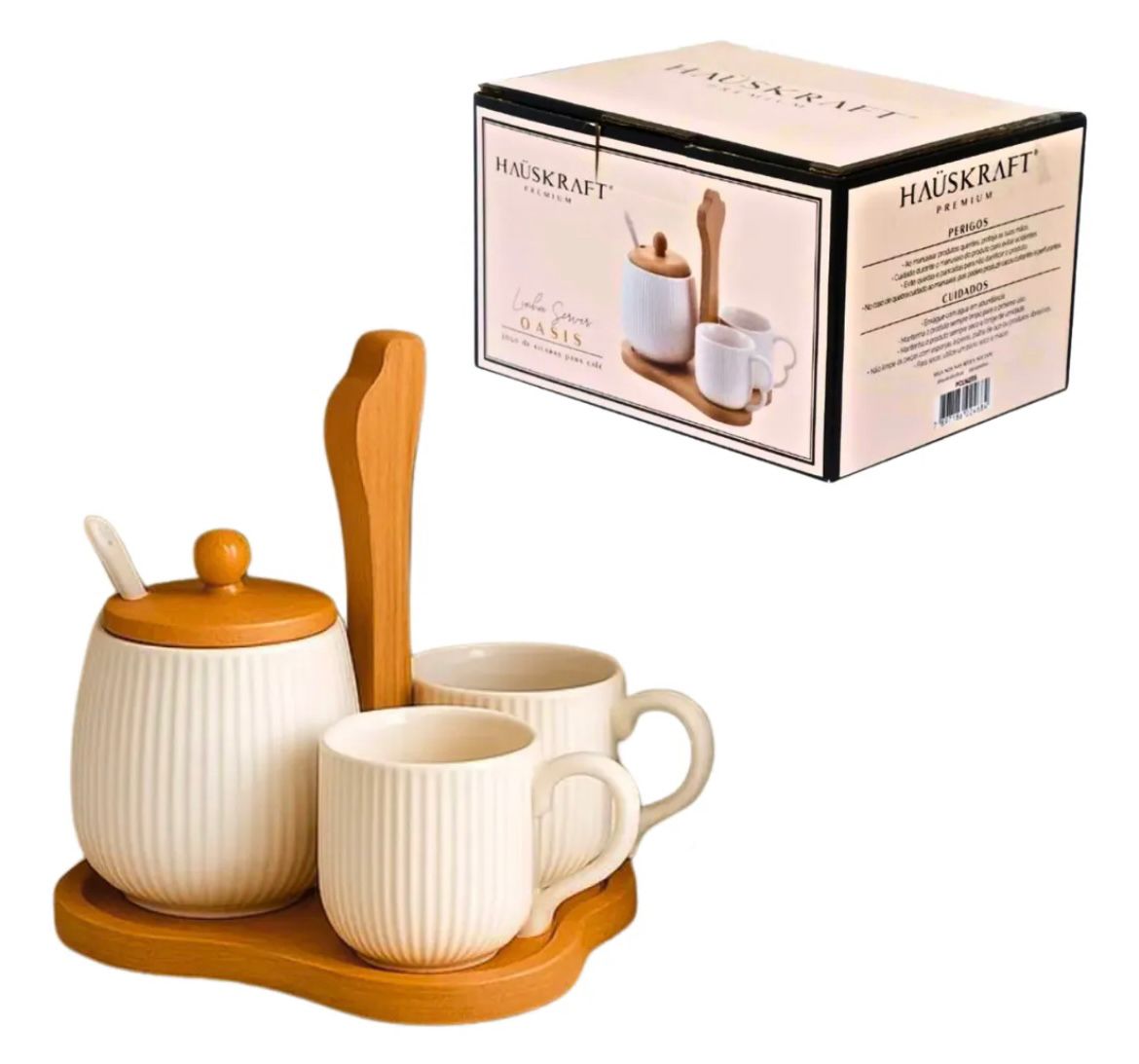 O conjunto apresenta acabamento em cerâmica branca com detalhes em madeira clara, compondo peças de alta qualidade e design atemporal. O açucareiro possui tampa com pegador esférico e colher exclusiva para servir. As xícaras têm alça confortável para segurar com firmeza. O jogo é perfeito para uso diário ou para receber visitas com charme e funcionalidade.