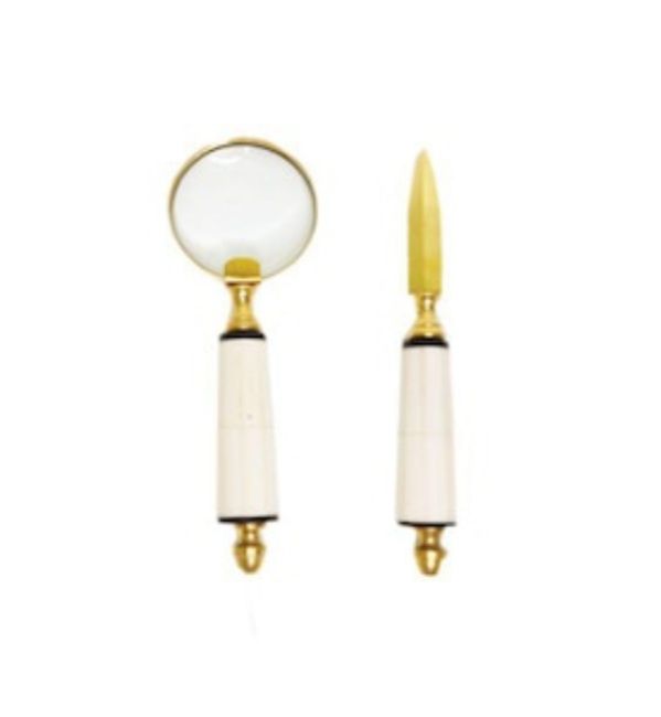 Kit Lupa e Abridor de Carta Kit com mini lupa e abridor de carta de cor branco que possuí material em metal, vidro e resina. Aqui você adquire uma peça clássica que pode servir como um elegante objeto de decoração na mesa de trabalho ou escritório. Esse tipo de peças eram usadas no passado somente para ajudar na visualização de pequenos objetos. Nos dias de hoje fazem o maior sucesso também no design de interiores, além de serem lindas peças, são perfeitas parar compor a decoração do seu escritório, sala de estar e mesa de centro e canto