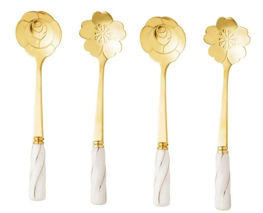Cj 4 Colheres Aço Inox P/ Chá Cabo Cerâmica Flowers Dourado/ Branco