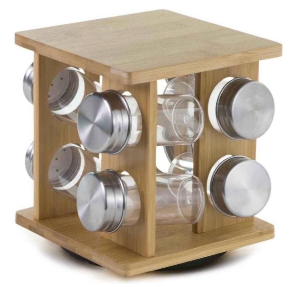 Feito em bambu, possui base rotatória e acompanha 8 recipientes.