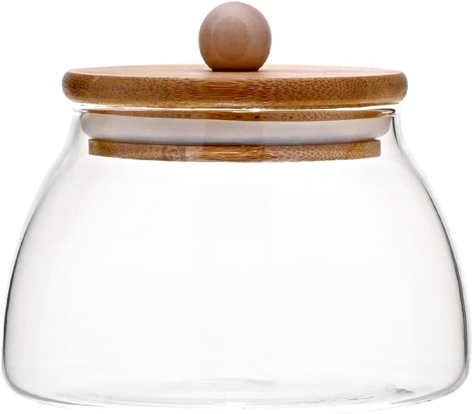 • DESIGN: Nosso pote é feito em vidro borossilicato e a tampa em bambu que possui uma borracha que veda o pote garantindo que a qualidade dos produtos ou alimentos sejam mantidas. Medidas: Comprimento e Largura 11,2cm, Altura 11cm e pesa 182 gramas. Tem capacidade de 500ml