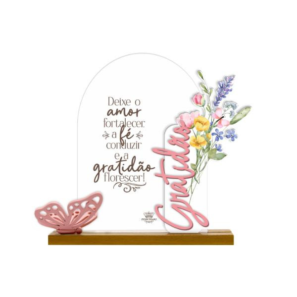 Esta plaquinha decorativa da Zenir Disarz é ideal para quem quer transmitir mensagens positivas e valorizar momentos especiais. Com design delicado e elementos em acrílico, ela combina flores e a palavra “Gratidão” em destaque, apoiada por base de madeira resistente.