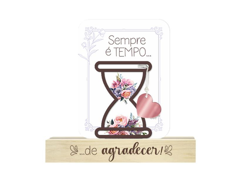 A plaquinha tem design com ampulheta e elementos florais em cores suaves, com acabamento em madeira natural na base, que oferece boa fixação e estabilidade. O material é leve e simples de acomodar como parte da decoração ou lembrança para convidados.