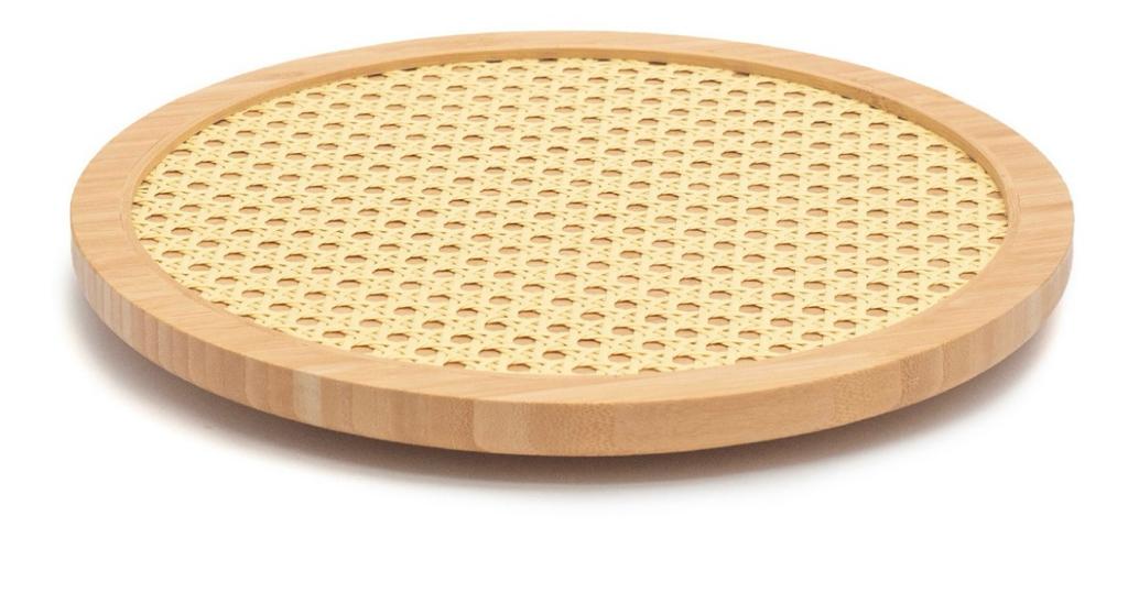 Essa é a tábua com base giratória de bambu com textura de palha da OIKOS.