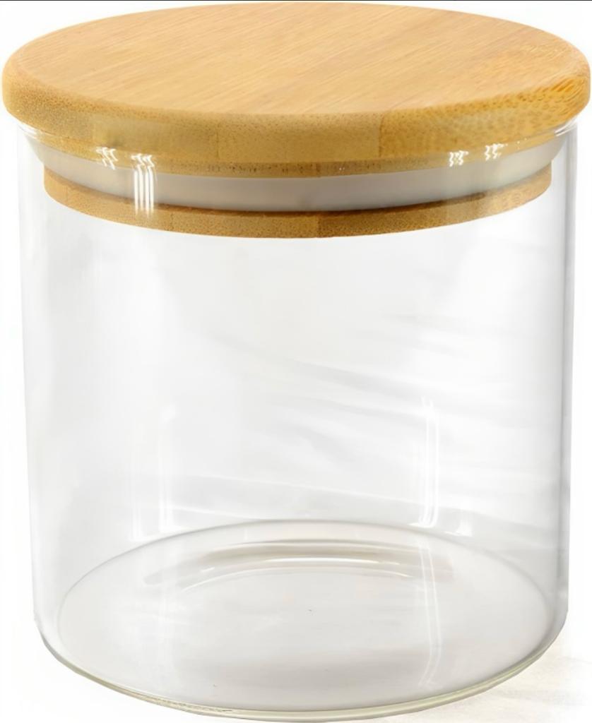 Esse é o pote de vidro hermético redondo de 500ml para mantimentos com tampa de bambu da OIKOS.